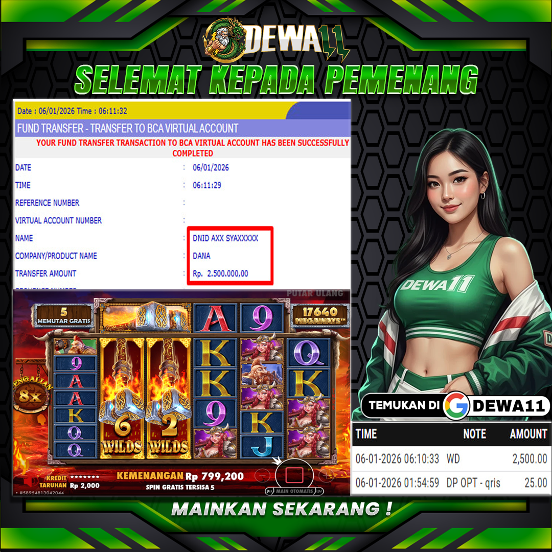 Gabung bersama DEWA11 dan Dapatkan kesempatan jackpot sensasional dalam 15 menit seperti bukti banner ini bukan sekedar janji hanya Depo 25k Withdraw 2,5 juta hari ini.